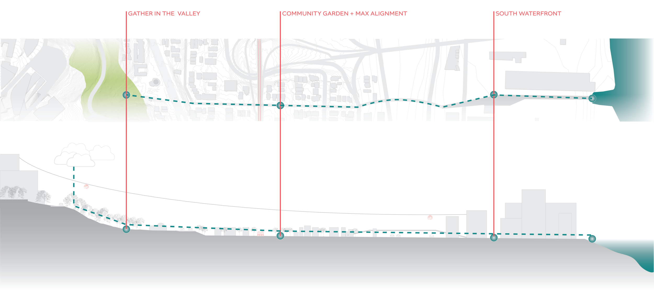 As the project site is located in the vally of a hillside, leading toward the Willamette River, this project offers a unique opportunity to treat a large amount of on site water. Through the use of topography, the water can be collected, transported, and naturally treated throughout its journey. People naturally like to gather around water, thus making certain points in its travel to the river natural gathering areas for the public. This not only allows for a consistant system of daylighting throughout the waters journey, but also educational oportunities for the public on methods for collected, slowing, and cleaning water.