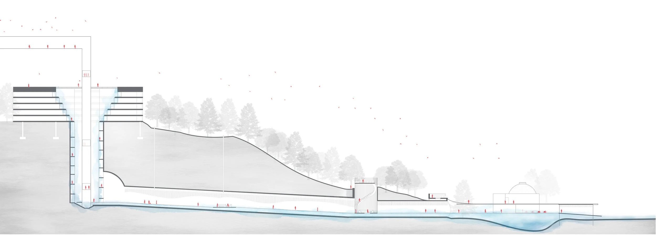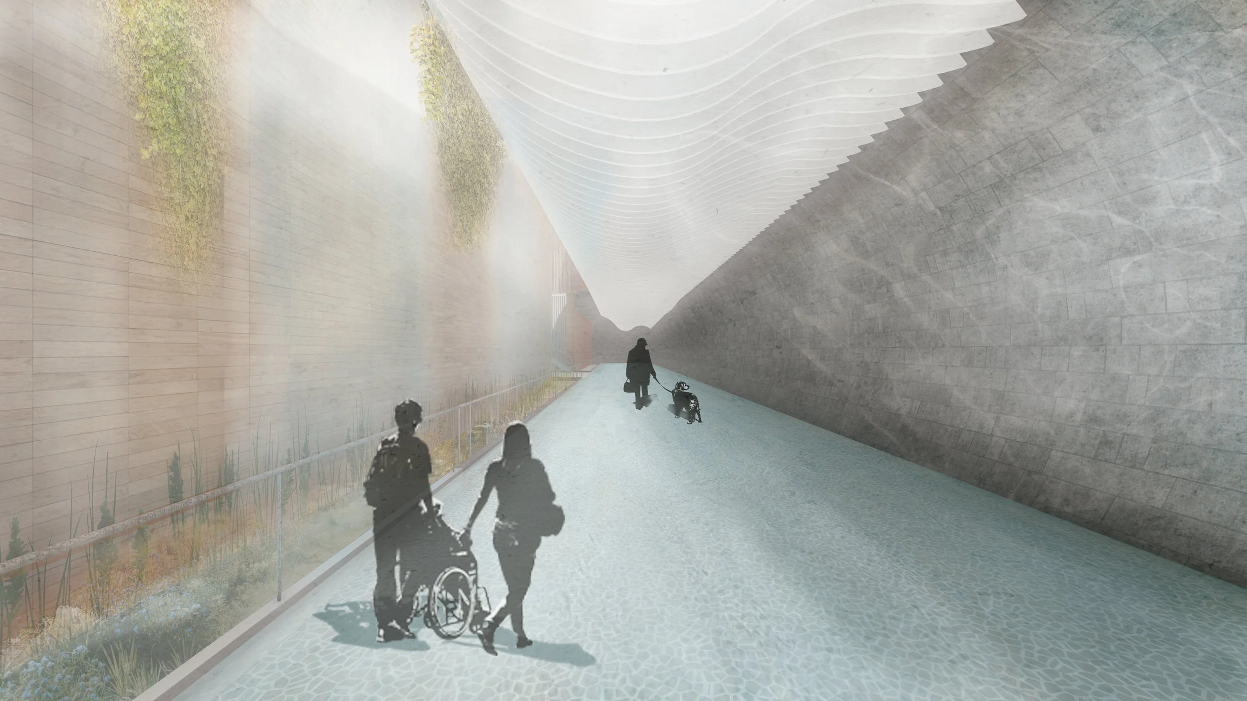 In the Living Tunnel, people and water pass below the Markim Hill poviding the most direct pathway between OHSU and the light rail train stop. While people pass above the walk way, water continues beneate it being treated all its way. Slits open the tunnel up to the enviornment above, allowing runoff from the park become a sensorial feature as its cascades into the tunnel below. Between the movement of people, running water, and falling water, it becomes a living, breathing system of its own.