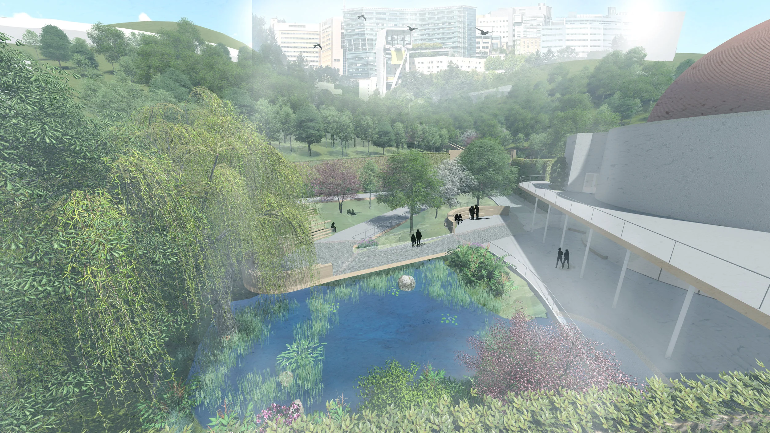 From the train, visitors are greeted by the Pooling Plaza, where both water and people are collected to begin their experience up the Markim Hill. Serving as the front porch to OHSU, it is expected that thousands of people will pass through this entry every day. For the people, it provides a place for rest, relaxation, and a connection to the outdoors. For the enviornment, it serves as a method to slowdown the water, and daylight it to help in its treatement process.