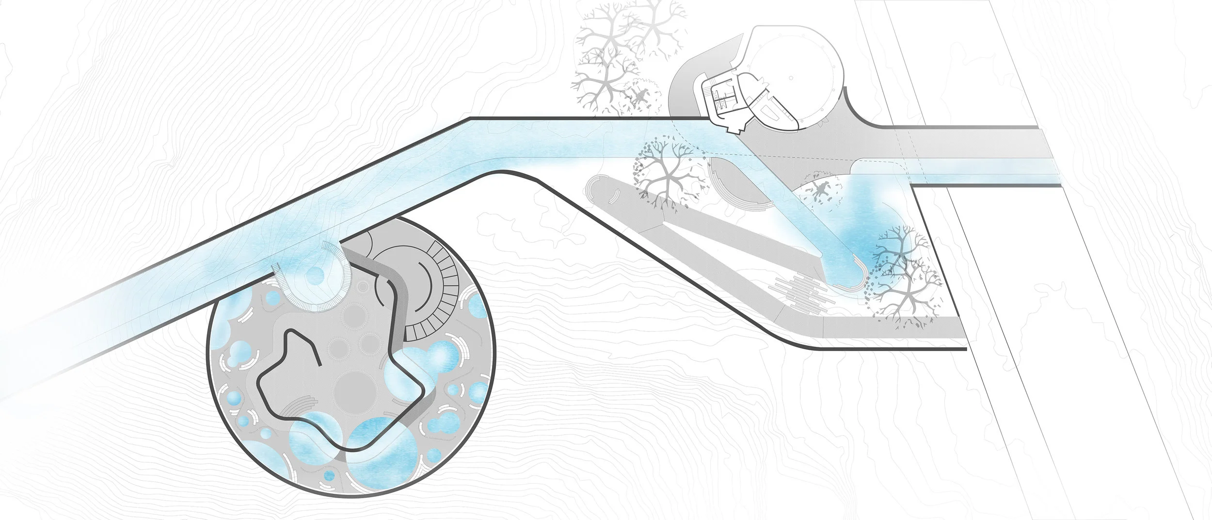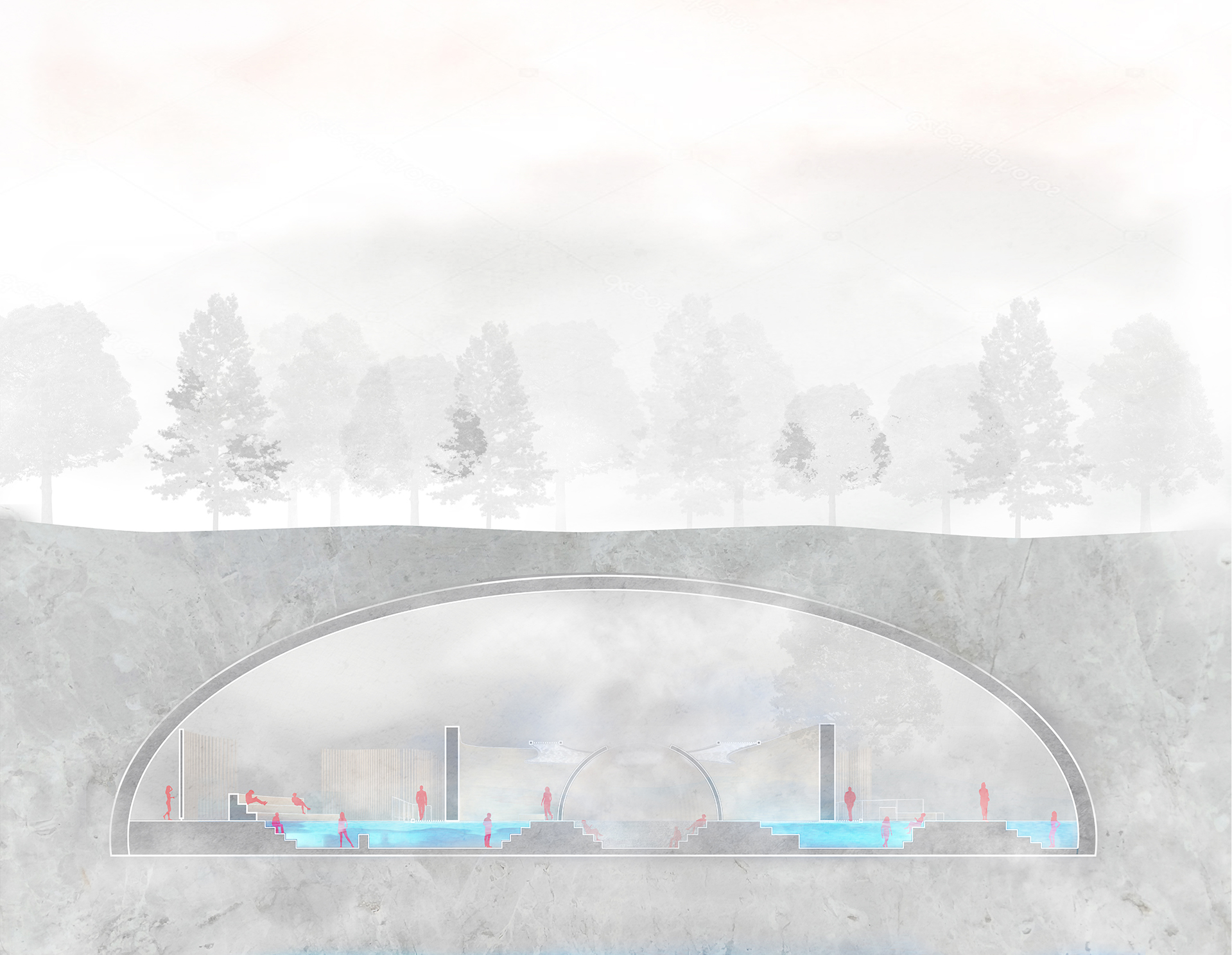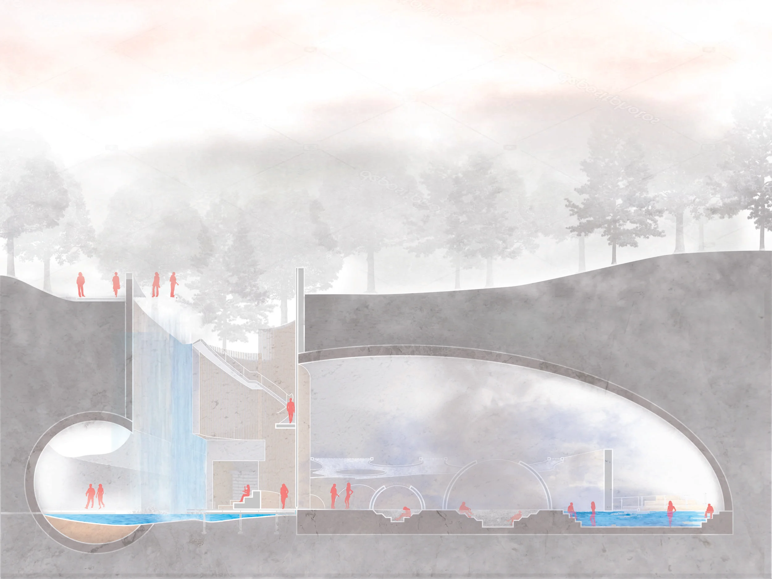 Located beneith Markim Hll, is the Buried Bathhouse. Open tot he public, this destination serves as another location for both water and people, and the dance the share. Breaking up the journe through the living tunnel, this bathhouse serves as a place of rest and relaxation as its visitors pass between cool, warm, and hot pools, ultimately ending in sauna spheres. The interacting play bettwen wood, concrete, water and light provide for an experience unique to its location and dance between the natural and man environments.