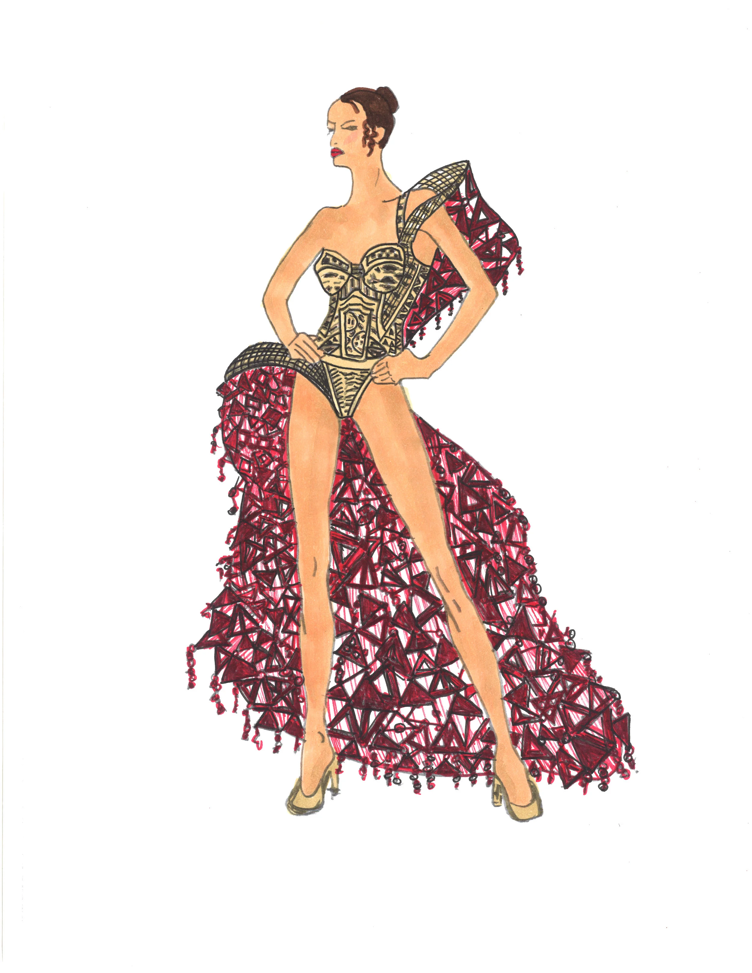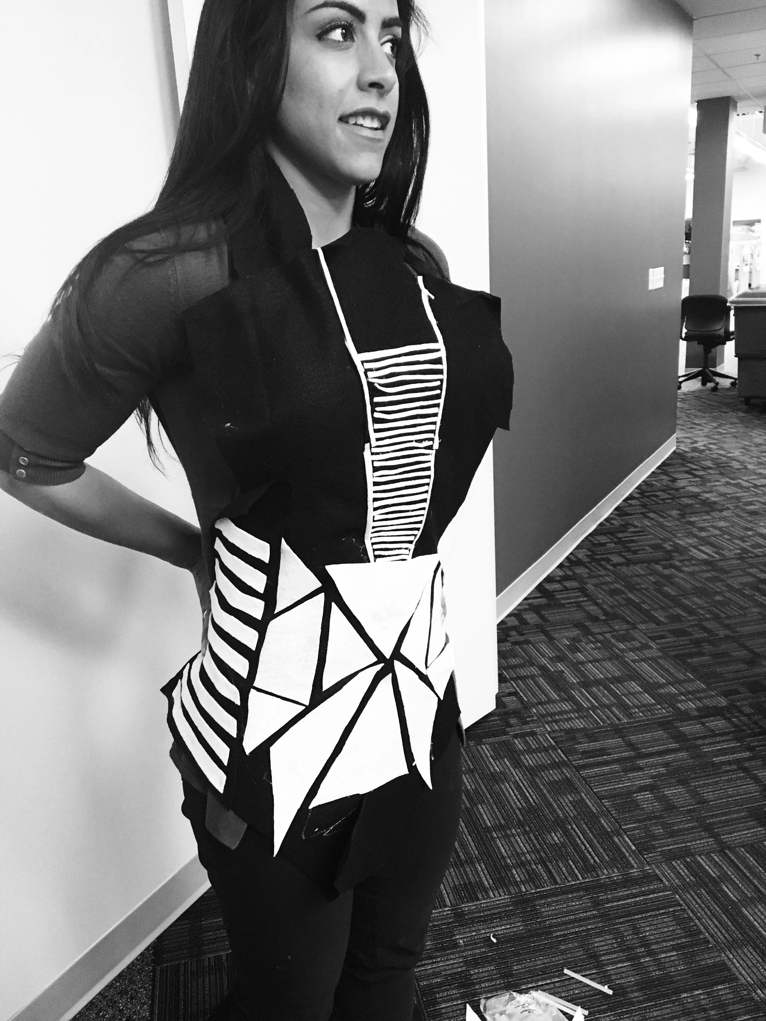 After randomly drawing Jennifer Lopez as our inspiration, we chose to pull our design influence from her iconically recognized feminine curves and provocative style. She has an ability to blend together beauty and irregular form. We chose to articulate her style and juxtaposition into a piece meant to have highly contrasting elements. The dress, much like J-Lo, conflicts whether to be form fitting or overly exuberant. The use of geometry, both close to the body and distant, creates relationships meant to symbolize J-Lo’s individuality and constantly fluctuating style.