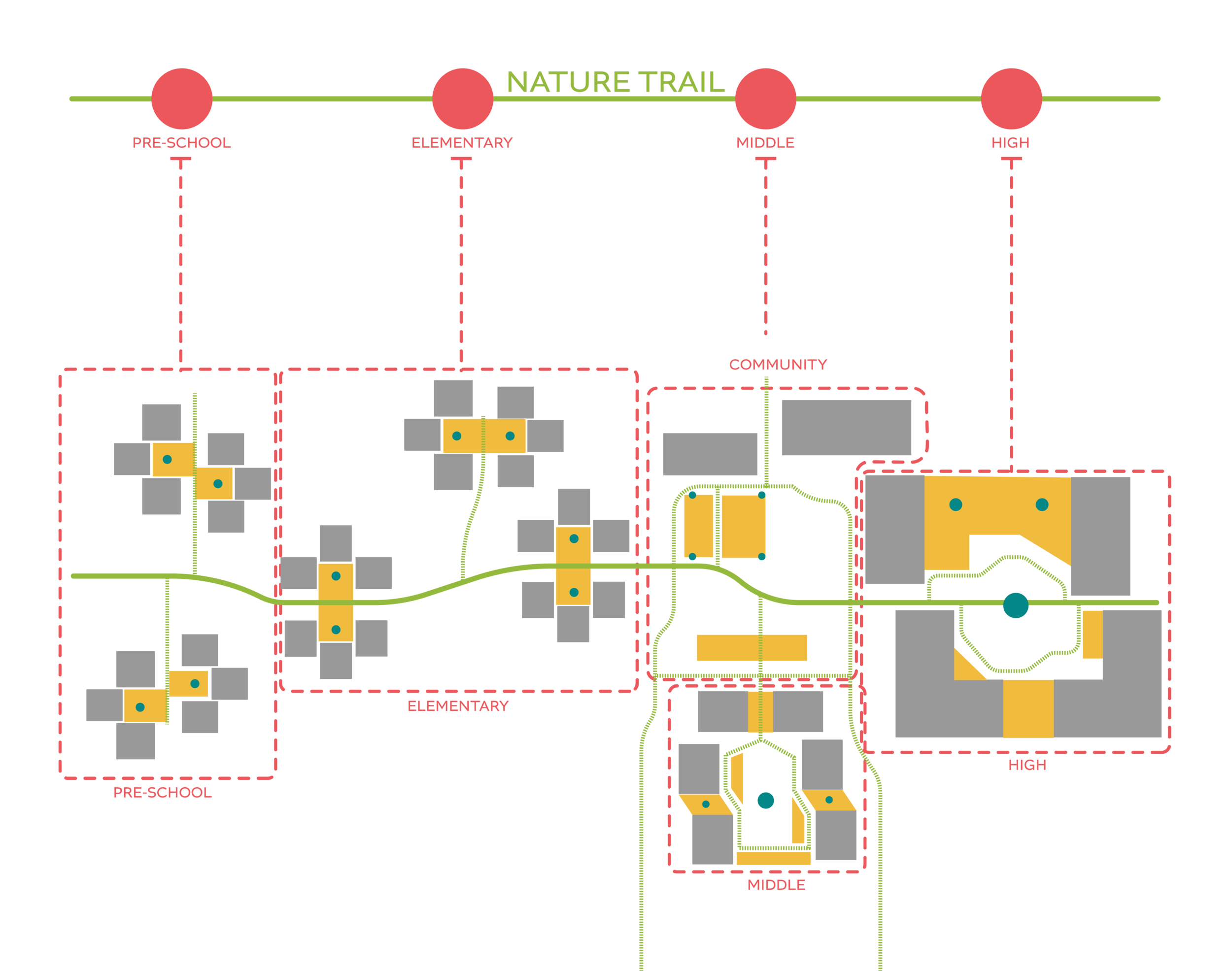 The ability for am explorer’s (student’s) space to evolve with the student was a method developed to provide safety and gradual change for the explorer. In the elementary school, students are taught all their subjects in a cluster, a collection of nature labs (classrooms). Different nature labs are designed to reflect surrounding natural elements based on their subject. As an explorer transitions into middle school, a little more independence is given as the explorer’s subjects rotate between different levels of their clusters. By the time a student reaches high school, the same explorer is now navigating between subjects in more of a campus feel. As all grades are taught in the same school, this was a strategy for those explorers to feel a sense of progression through their accomplishments.